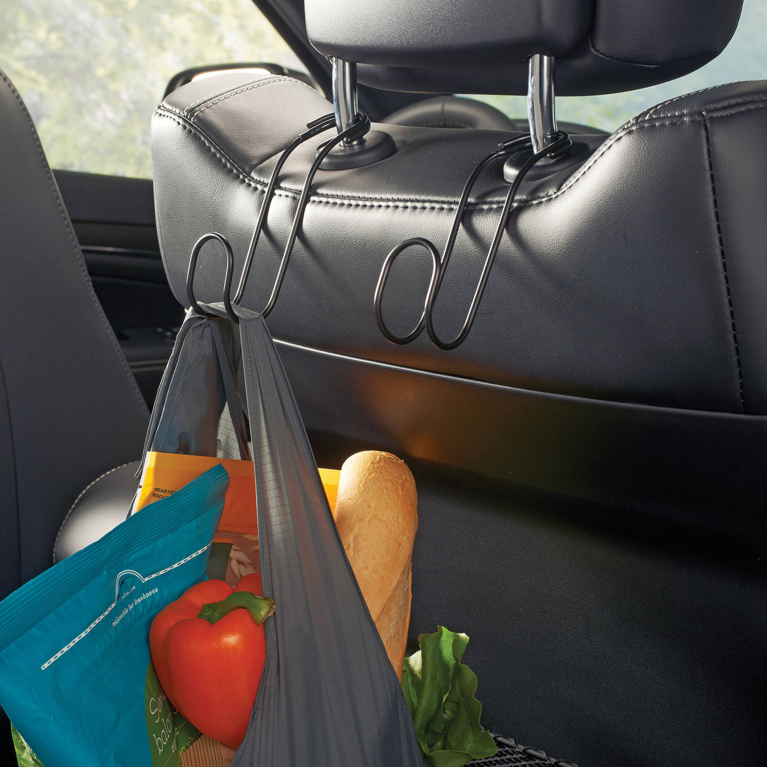 Now you can easily add hanging storage space to your vehicle with the Car Hangers. These headrest hooks are constructed from durable metal to provide long lasting function and the matte black finish complements the interior of most any vehicle. These car storage hooks are designed to hang off the post of your headrest. Simply open the loops and slide them around the headrest post for a quick and easy installation process. These headrest hooks can be positioned to face the backseat or front seat as needed to keep your purse or grocery bag securely stored. The contoured design of the hooks keep bags securely stored and raised off the floor to protect them while the car is in motion. Each metal storage hook is designed to hold up to 25 pounds in weight and two hooks are included in each set to hold a total of 50 pounds. Car Hangers Features Provides versatile hanging space for tote bags purses or grocery bags. Open the loops and slide them around a headrest post for installation.